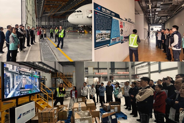 随后,学员们前往南航大兴机库 —— 这座亚洲跨度最大、单体规模最大的维修机库,建筑面积近4万平方米,跨度超400米,下弦高度30米,最多可同时容纳2架A380、3架B777和3架窄体机并行维修。现场3架空客A380飞机正在检修的震撼场景,让学员们深刻领略了中国民航世界级维修保障能力;在智能化航材库,学员们详细了解全自动化仓储、物联网管理体系,见证南航为大兴机场及北方片区打造的坚实航材保障屏障,深入学习民航维修领域的全链条管理经验。