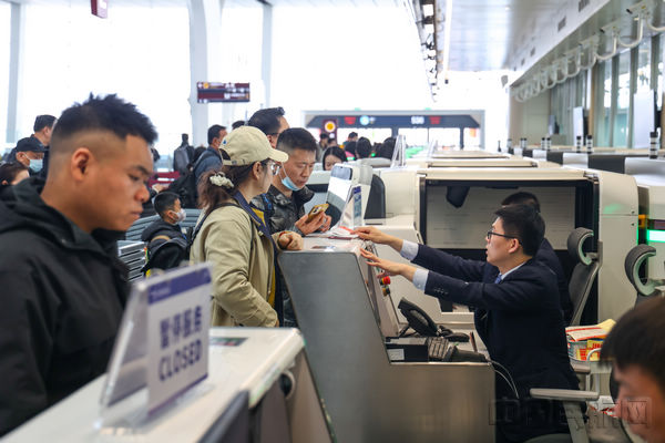 值机员为旅客办理值机手续(李宜鹏/摄)