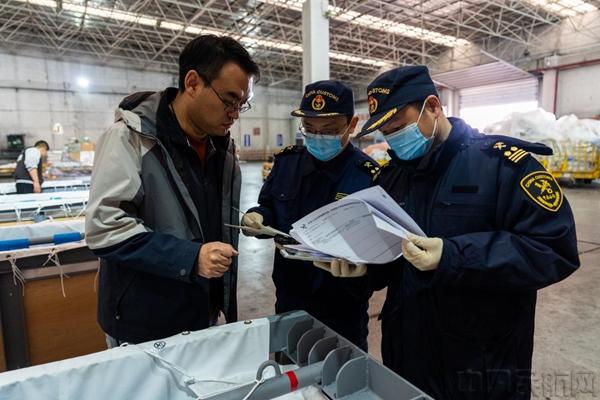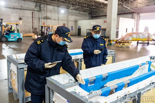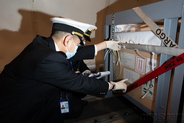 天津滨海机场海关现场查验关员(简称“现场关员”)登上货机,对入境瓶鼻海豚的运输单证与箱体标识进行现场核验