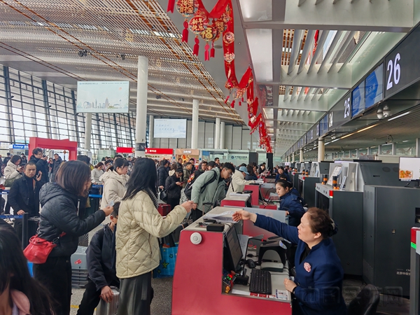 春运期间,机场客流持续走高,探亲、旅游、务工多重客流叠加特征明显。热门航线中,成都、深圳、广州航线旅客吞吐量位居前三,沈阳、揭阳、哈尔滨等方向客座率持续超90%。2月10日至3月1日为出行高峰期,日均旅客吞吐量达1.68万人次,其中2月21日起连续6天单日客流超1.8万人次,客座率保持90%以上。