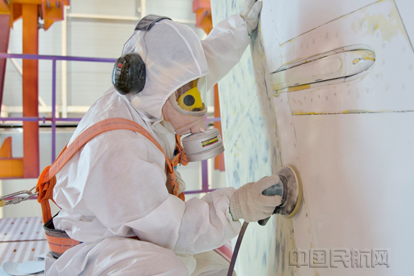 在海南自贸港一站式飞机维修产业基地,海航技术机务正在执行飞机喷涂工作