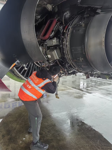 重任在肩,专业为先。监修领队郭建立足统筹全局,提前制定专项方案,高效对接协作单位、加急协调航材资源、精准划分任务节点,全程坐镇现场解决突发问题,确保各环节无缝衔接。定检员姜慧明凭借丰富维修经验,严把质量关口,对发动机吊装、线路对接等关键工序逐一核查,严守手册规范,杜绝任何细节疏漏。南京航线的王翔发挥扎实技术功底,全力完成系统测试、故障排查等工作,反复校验各项数据,精益求精把控每一个操作细节。