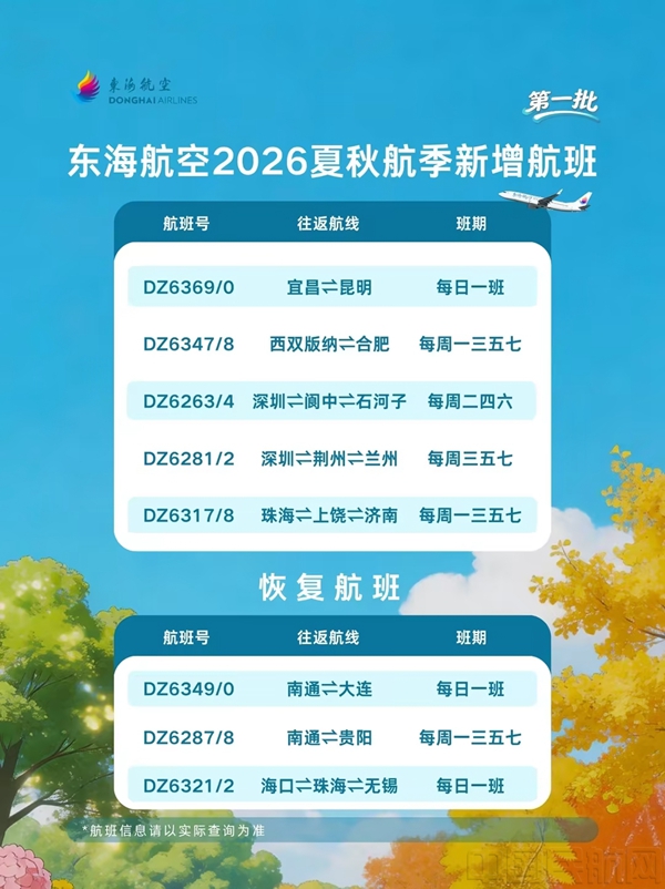 《中国民航报》、中国民航网 记者冯智君 报道:2026年夏秋航季将于3月29日正式启动,东海航空贴合旺季旅游出行热潮与市场消费需求,优化升级航线网络布局。新航季运营航线56条,通达宜昌、昆明、西双版纳、石河子、呼和浩特等51座国内热门城市,进一步深化大湾区核心城市与全国多地的航线互联互通,丰富旅客出行选择。