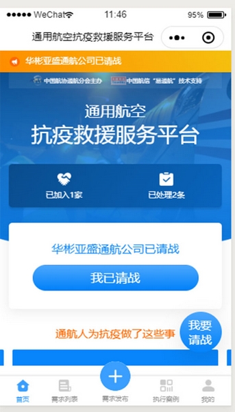 需求方可以在平台上发布需求信息,通航公司可申请加入“通用航空抗疫救援服务平台”承运方,开展紧急运送医疗物资、航空喷洒(消毒灭杀)、无人机作业和包机复工等服务。同时,平台会实时显示各个通航公司的服务情况,便于形成有序的服务体系。
