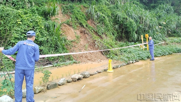 排查发现轻微山体滑坡隐患后迅速做好现场警戒