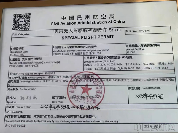 新舟鸿鹄HH-200航空商用无人运输系统首飞准备工作一切就绪后,民航西北地区管理局向中航西飞民用飞机有限公司颁发了民用无人驾驶航空器特许飞行证。