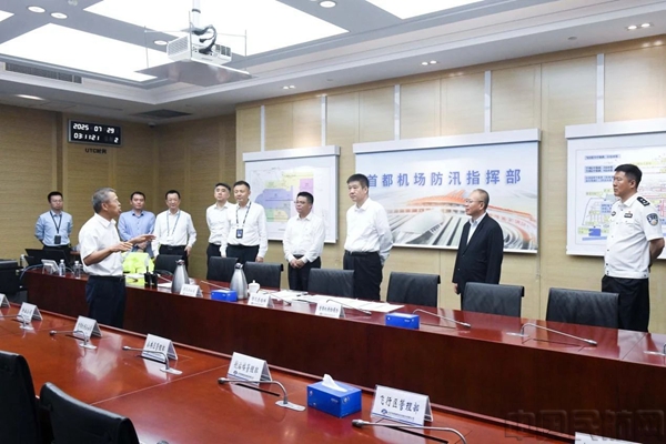 宋志勇在首都机场运行控制中心调研防汛工作开展情况(记者张哈斯巴根/摄)