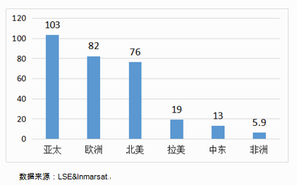 在这300亿美元的市场蓝海中,亚太地区为103亿美元、占比34.3%,欧洲地区为82亿美元、占比27.3%,北美地区为76亿美元、占比25.3%,拉美、中东、非洲分别为19亿、13亿、5.9亿美元(见图1)。20年内,亚太地区将成为全球最大的机上互联市场。图1:2035年全球各区域机上互联市场收入(亿美元)