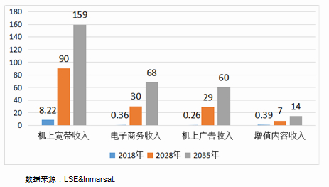 (三)机上广告收入。主要是指以机上联网为载体的各种广告所产生的费用,依据网上点击量、广告展现量、与广告商的赞助协议等获得的收入。在机上联网出现以前,传统的机上广告业务已经开展,包括背投屏幕节目广告、机上杂志、座椅广告等。实现机上联网以后,机上广告的形式将更加多样,内容将更加丰富,收入来源将进一步拓宽。2018年与机上联网相关的广告收入为0.26亿美元,也处于起步阶段,2028年将达到29亿美元,2035年进一步提升至60亿美元,成为机上互联市场的第三大收入来源。