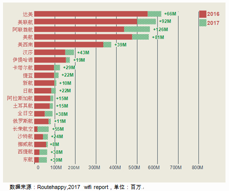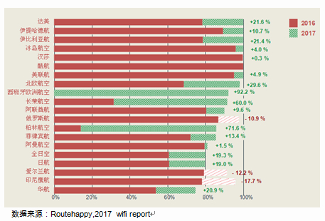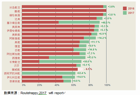 根据国外权威机构Routehappy最新发布的2017 全球机上Wi-Fi报告显示,目前全球共有70余家航空公司已提供机上 Wi-Fi。按照可联网座位里程(ASM) 计算,2017年全球民航客机39%的比例能够机上联网,美国航企83%的飞机可以机上联网,美国以外地区28%的飞机可以机上联网。特别是世界主要航企在机上联网上已经处于领先地位,机上联网已成为世界一流航企的标配。