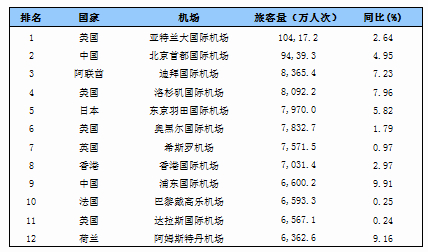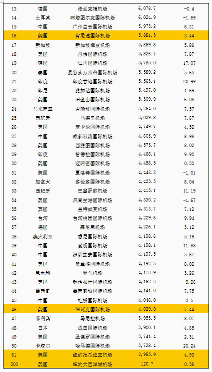 表2:2016年全球前50大机场排名(旅客吞吐量)
