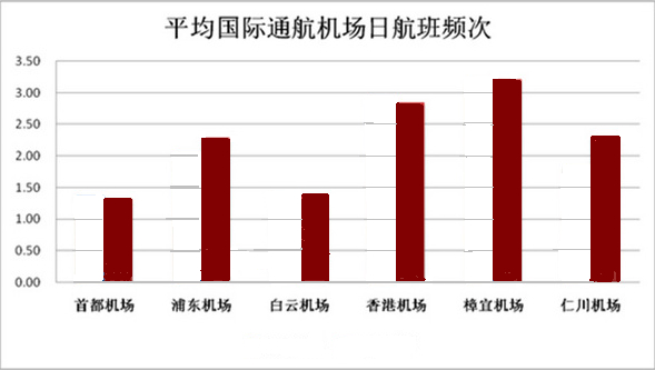 影响航线枢纽的另一个重要方面是“航线网络厚度”,一般用航班频次来度量。2017年3月,肯尼迪机场国际航班日均频次为2.79,纽瓦克机场国际航班日均频次为1.88。为了方便比较,我们可以对比一下2016年首都机场、浦东机场、白云机场、香港机场、樟宜机场与仁川机场的国际航班日均频次(详见表4)。
