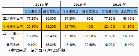 表7:2014-2016年肯尼迪、纽瓦克机场中转旅客比例