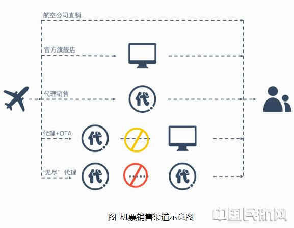 此前,机票从航空公司到旅客手中大体上有五条路径。第一,航空公司直销,即航空公司通过官网、APP、微信、呼叫中心、售票柜台等自营直销渠道,把机票直接卖给旅客。第二,在线官方旗舰店,即航空公司通过携程等OTA平台、天猫等电子商务平台上开设的官方旗舰店,将机票销售给旅客。第三,代理销售,即航空公司通过代理商,将机票销售给旅客,这里的代理商可能是有门面的传统机票代理、有呼叫中心的差旅服务供应商、也可能是携程、去哪儿这样的OTA。第四,代理+OTA,即代理商利用携程、去哪儿等OTA平台,销售航空公司机票。第五,“无尽代理”模式,航空公司大代理商利用后返政策的漏洞,千方百计冲高机票销售量,利用51book、今日天下通等代理销售平台,补贴部分返点将机票以更低的价格“批发”给中小代理,中小代理再销售给旅客。比如在国内机票代理费率为0的情况下,大代理希望能拿到3%后返,于是就把利用代理销售平台把机票以1%的奖励批发给中小代理。这一模式下一张机票有时可以经过近10家代理商转手。