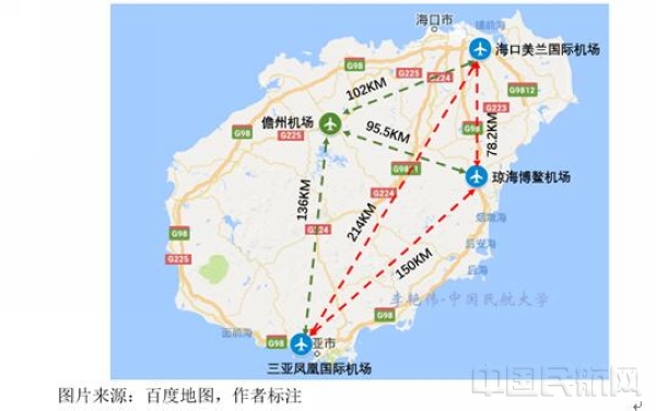 海南岛共有四个机场,即:海口美兰国际机场、三亚凤凰国际机场、琼海博鳌机场和儋州机场。四个机场的具体位置如下图所示。