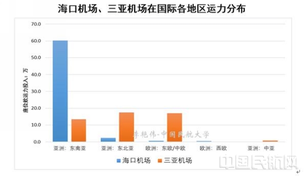 即使有部分重叠国际市场,两个机场也都保持了很好的相对优势。例如在仁川机场,三亚的运力投入高于海口机场;在曼谷机场,海口的座位运力投入远高于三亚。既满足了腹地市场出行需要,又保持了在该航线在某一机场重点发展的优势地位。