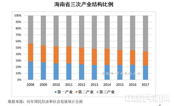 由于特殊的地理位置所决定了海南省独特的气候、文化、经济社会发展特征。海南省近10年三次产业结构不断调整优化,服务业所占比例越来越高。2017年服务业比重在产业结构中已经超过55%。