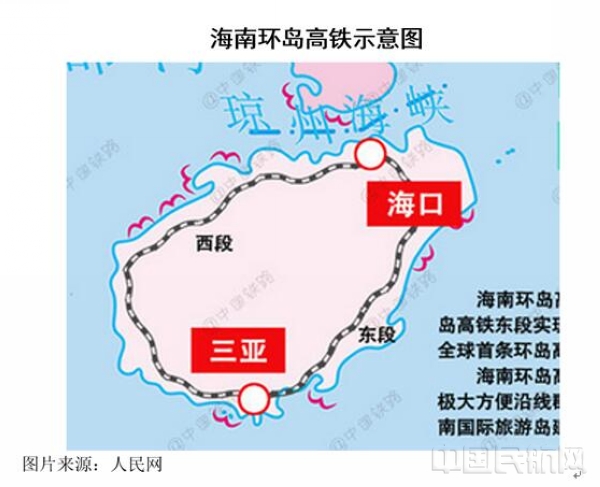 在高铁方面,海南环岛铁路由海南东环铁路和海南西环铁路组成,连接海口至三亚,东环308公里,西环345公里。海南东环铁路250时速运行,海口至三亚最快只需用时1小时23分。