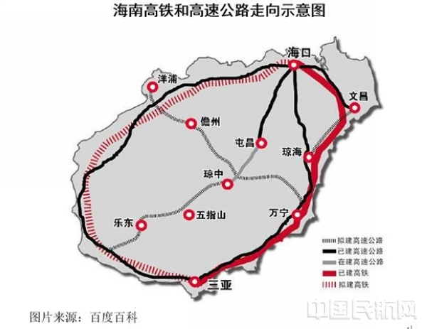 海南省在综合交通运输规划方面,无论是高速公路,还是高铁,都采用了环岛而建的思路。在高速公路方面,包括:环岛东线高速公路、环岛西线高速公路、中线公路。整体通车里程达1.7万余公里,以“三纵四横”为骨架,“田”字型高速公路主骨架日渐成形(如下图所示),有干线直通各港口、市、县,并有支线延伸到全岛318个乡镇和各旅游景点。
