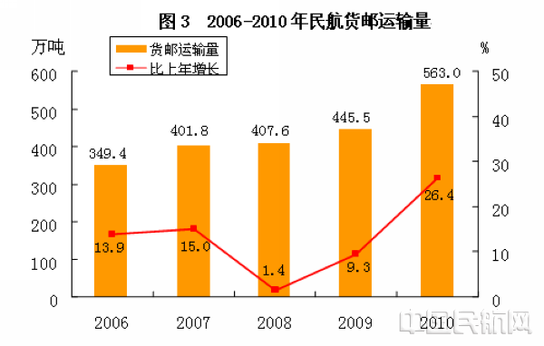 3.货邮运输量2010年,全行业完成货邮运输量563.0万吨,比上年增加117.5万吨,增长26.4%。国内航线完成货邮运输量370.4万吨,比上年增加51.0万吨,增长16.0%,其中港澳台航线完成21.7万吨,比上年增加5.8万吨,增长36.2%;国际航线完成货邮运输量192.6万吨,比上年增加66.5万吨,增长52.8%。