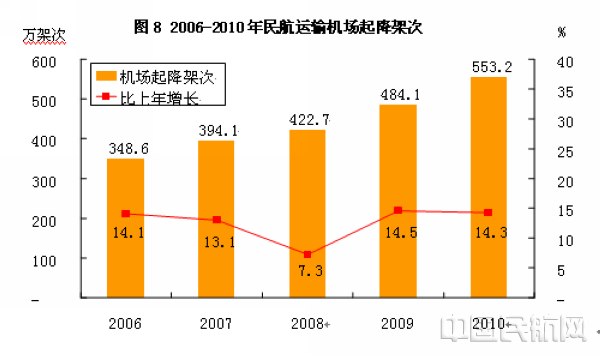 2010年,全国运输机场完成起降架次[7]553.2万架次,比上年增长14.3%。“十一五”期间全国运输机场起降架次年平均增长率12.6%。