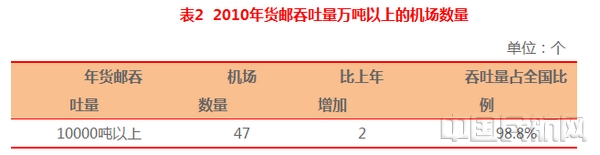 2010年,年货邮吞吐量10000吨以上的运输机场47个,其中北京、上海和广州三大城市机场货邮吞吐量占全部机场货邮吞吐量的56.7%。