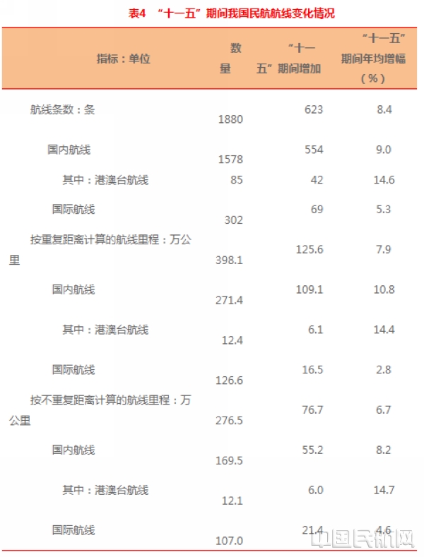 7.航线网络截至2010年底,我国共有定期航班航线1880条,按重复距离计算的航线里程为398.1万公里,按不重复距离计算的航线里程为276.5万公里。“十一五”期间定期航班航线增加623条,年均增长8.4%,按重复距离计算的航线里程增加125.6万公里,年均增长7.9%,按不重复距离计算的航线里程增加76.7万公里,年均增长6.7%。