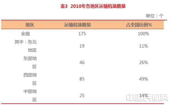 其中:2010年东部地区[5]完成旅客吞吐量3.39亿人次,东北地区完成旅客吞吐量0.34亿人次,中部地区完成旅客吞吐量0.53亿人次,西部地区完成旅客吞吐量1.39亿人次。