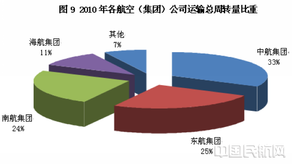 9.运输航空(集团)公司生产截至2010年底,我国共有运输航空公司43家,按不同类别划分:国有控股公司35家,民营和民营控股公司8家,全货运航空公司11家,中外合资航空公司16家,上市公司5家。