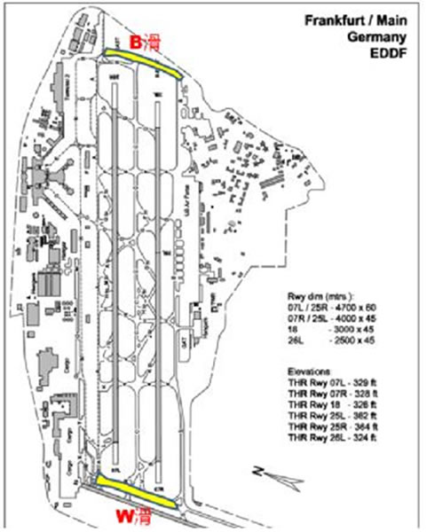 对于滑行道布局来讲,德国人的循规蹈矩在复杂大系统运行时还是很有效率的。法兰克福机场在实施二类运行时,严格规定只能使用跑道两头的B滑和W滑组成的“外环线”进行穿越飞行区的滑行,这使地面交通实现闭合环线成为可能。如图2所示。不管在哪条跑道落地,都可以沿中间的C滑到底,并加入B滑或W滑前往指定的候机楼,而起飞的航班不需要因为穿越跑道的航班而增加间隔,只要考虑二类运行时相邻五边的间隔即可。