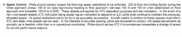 在希思罗的AIP中有这样一条规定,飞行员转向五边后,必须严格保持表速160节,直到距跑道4海里处。这样严格的速度规范,可以使连续落地的航班以3海里的纵向间隔落地,从而最大可能地提高终端区进港航班的容量。