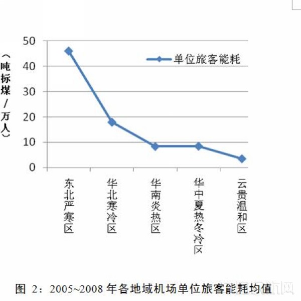 1)东北严寒区机场单位旅客能耗最高,云贵温和区机场最低,相差13倍之多;华南炎热区和华中夏热冬冷区机场的能耗水平居中且相当。