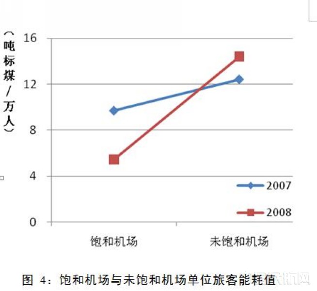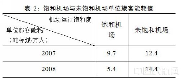 数据表明(见图4),饱和运行机场能耗水平明显低于未饱和运行机场。而由于2008年,首都、天津、武汉等机场扩建完毕,未饱和机场数量增多,本年度未饱和运行机场的能耗水平高于上一年度未饱和运行机场。