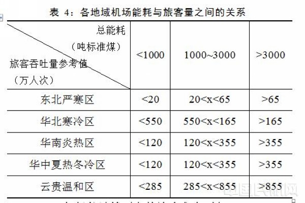 1)为了更好开展机场节能减排工作,笔者参照国家发改委对工程建设能耗要求:年总能耗小于1000吨标煤的机场填写节能登记表;年总能耗介于1000~3000吨标煤之间的机场单独编制节能评估报告表;年总能耗大于3000吨标煤的机场单独编制节能评估报告书。推算出了在各地域机场能耗与旅客量之间的关系(见表4),供各机场参考。
