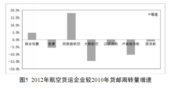 (2)发展速度。作为宏观经济的晴雨表,航空业极易受到外部经济环境的影响。2008 年金融危机后,随着经济复苏,2010 年航空货运业均有了大幅回升。然而,之后受到欧洲债务危机和国际经济萎缩影响,全球航空货运业暂时出现了负增长。如图5 所示,2012 年主要航空货运企业的货邮周转量和2010 年相比,均出现不同程度的下跌。