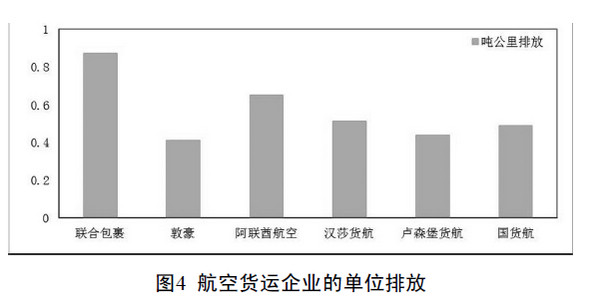(1)单位吨公里排放[7 ~ 13]。由于航空货运企业的单位吨公里排放都较低,如图4 所示,除了UPS 这种综合物流服务商以及阿联酋这种客货兼营航空公司单位排放相对较高,其他货运航空的单位排放均在0.5 左右,而欧盟公布的2012 年的基准值为0.6797 kgCO2/RTK[14],可以看出,主要航空货运企业均低于此基准值。因此,分配给航空公司配额时,将会产生剩余。