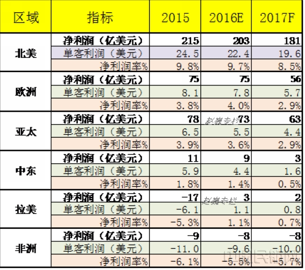 亚太航空公司2015年净利润78亿美元,2016年预估可以维持73亿美元,2017年预测63亿美元。平均单客净利润三年分别为6.5美元,5.5美元,4.4美元,低于全球平均水平和欧洲。净利润率2015年3.9%,2016年3.6%,2017年预测2.9%,低于全球平均水平,与欧洲基本相当,都处于恢复期。