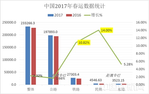 2017年春运数据自元月13日至2月12日。2017年春运全国铁路、公路、水路、民航共发送旅客233266.3万人次,同比2016年春运增长2.32%。