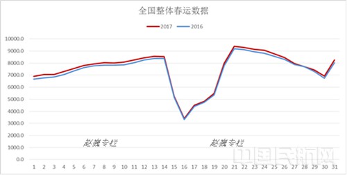 2017年正月初六(2月2日),全国共发送旅客9391.9万人次,也是历史新高;同比增长2.29%。