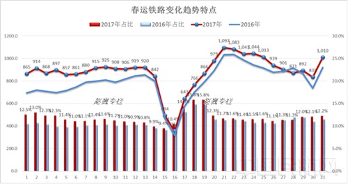 年三十开始运量大幅下滑,下降到55%左右,大年初一下降到40%左右。初三开始迅速恢复,整体占比则达到15%左右。初六达到春运高峰,连续四天每天运量超过1000万人次。