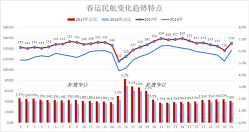 自腊月16春运开始,春运量开始缓步增加,腊月29达到节前高峰。大年三十开始下滑,大年初一处于春运低谷,一直延续到初三。初四开始运量爬升,初六长假前达到节后和整体春运高峰。