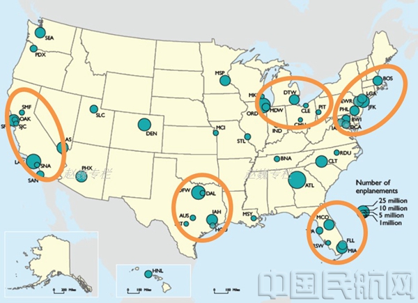 美国的国际航空枢纽已经与国内航空枢纽开始逐步分工,而且国际航空枢纽向沿海区域集中,同时形成不同的区域客户特点。