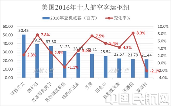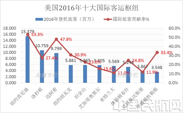 下图3是2016年美国十大国际航空客运枢纽统计情况。