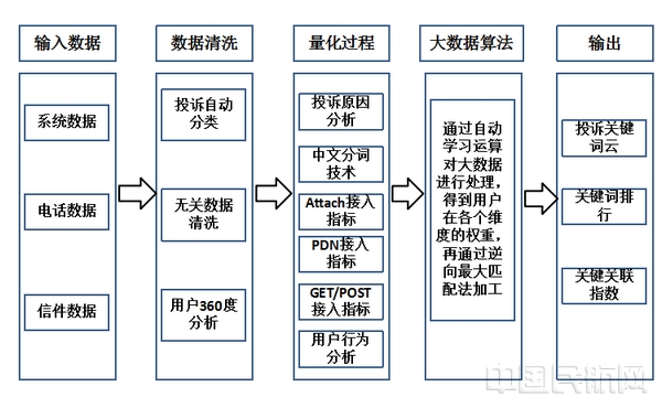首先对历史数据逐条进行自动分类,包括营销服务、地面服务、客舱服务、行李运输等等类别,便于统计分析。其实进行数据清洗,这里用到了文本挖掘中的中文分词技术,通过程序去识别旅客投诉详情信息中的一个个词语。之后进行量化过程,介入各种性能指标。最后经过大数据算法处理通过自动学习运算对大数据进行处理,得到用户投诉关键数据各个维度下的权重,再通过逆向最大匹配法得到关键词分值,产生输出结果。